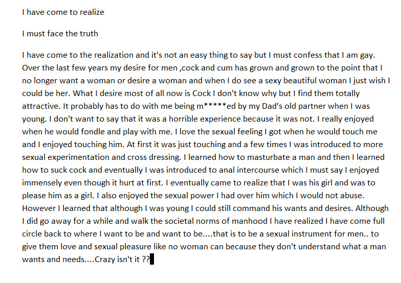 I would be doing it for all the Cock and yummy Cum. The pimp can keep whatever he or she makes. 3- I would love to rent a U-hual truck and put a glory hole in the back with a mattress so it would be a Mobil gloryhole/gangbang party truck and have someone drive me around . As for Me, I'm A Older Bi white Cross Dressing bottom Sissy Cum Slut, not quite passable, my body is very Feminine, but my face is still a little bit masculine, but working on it. I'm 5' 10". 130 lbs. Black hair, Smooth all over. I have A eight inch (when hard ) cut cock, I love to dress very sexy and slutty for my men, I'm also a little cum whore, I am so addicted to cum. I just love sucking cock and swallowing that warm creamy man juice, it's so yummy! I'm into being Bread and Gang Banged, I really love Outdoor Play and Public sex. I also Enjoy being watched and recorded. I have a huge dildo and High Heel collection. I'm on Prep.